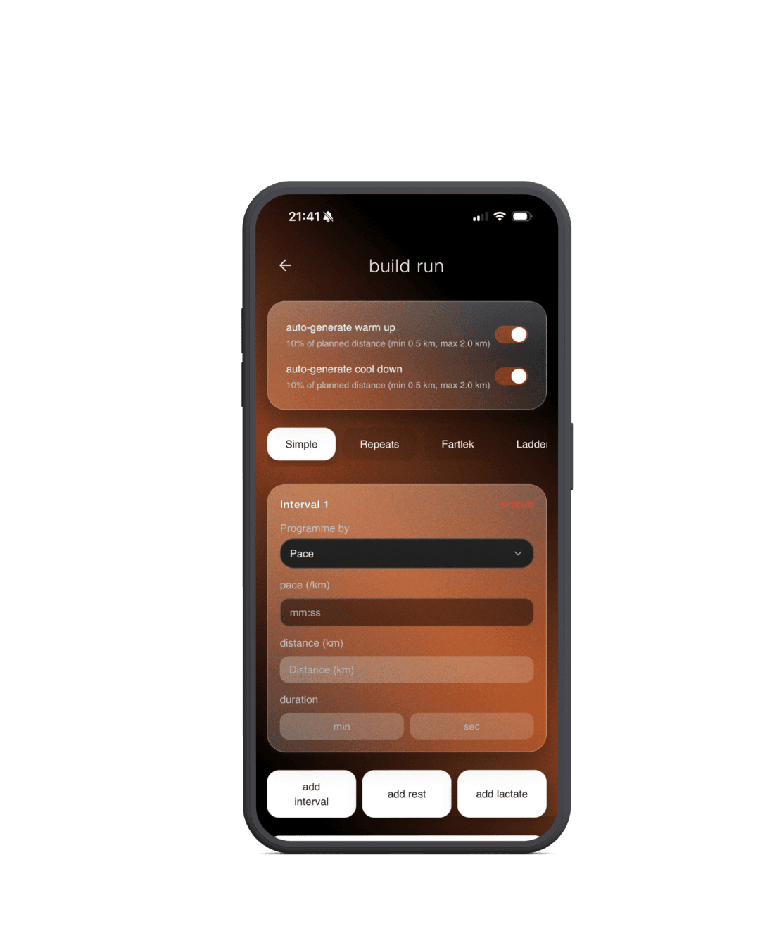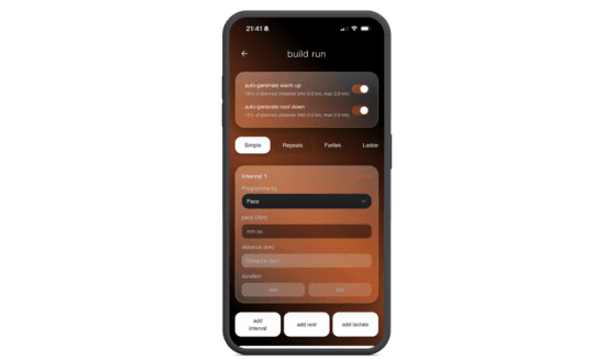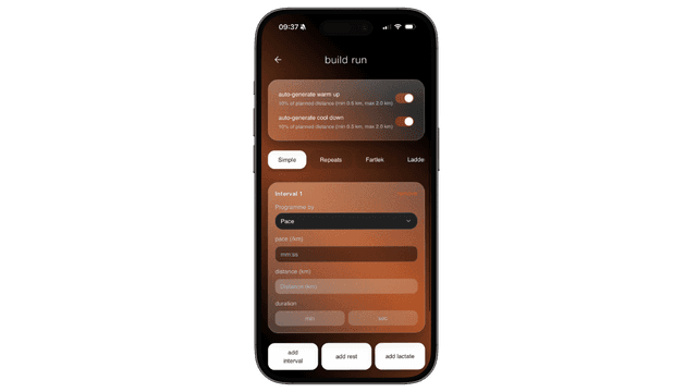 build structured sessions in seconds - from easy runs, to ladders, fartleks or progressive and pick your pace.